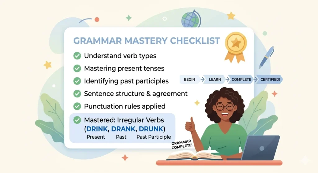 Remember the three-step pattern: drink, drank, drunk. If your sentence includes have, has, or had, choose drunk. If you describe something that happened yesterday or earlier without a helping verb, choose drank. This rule works across American English, British English, and global communication.